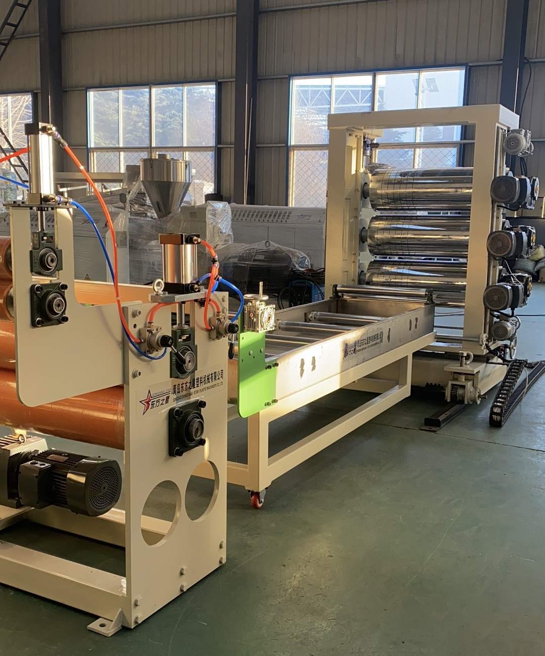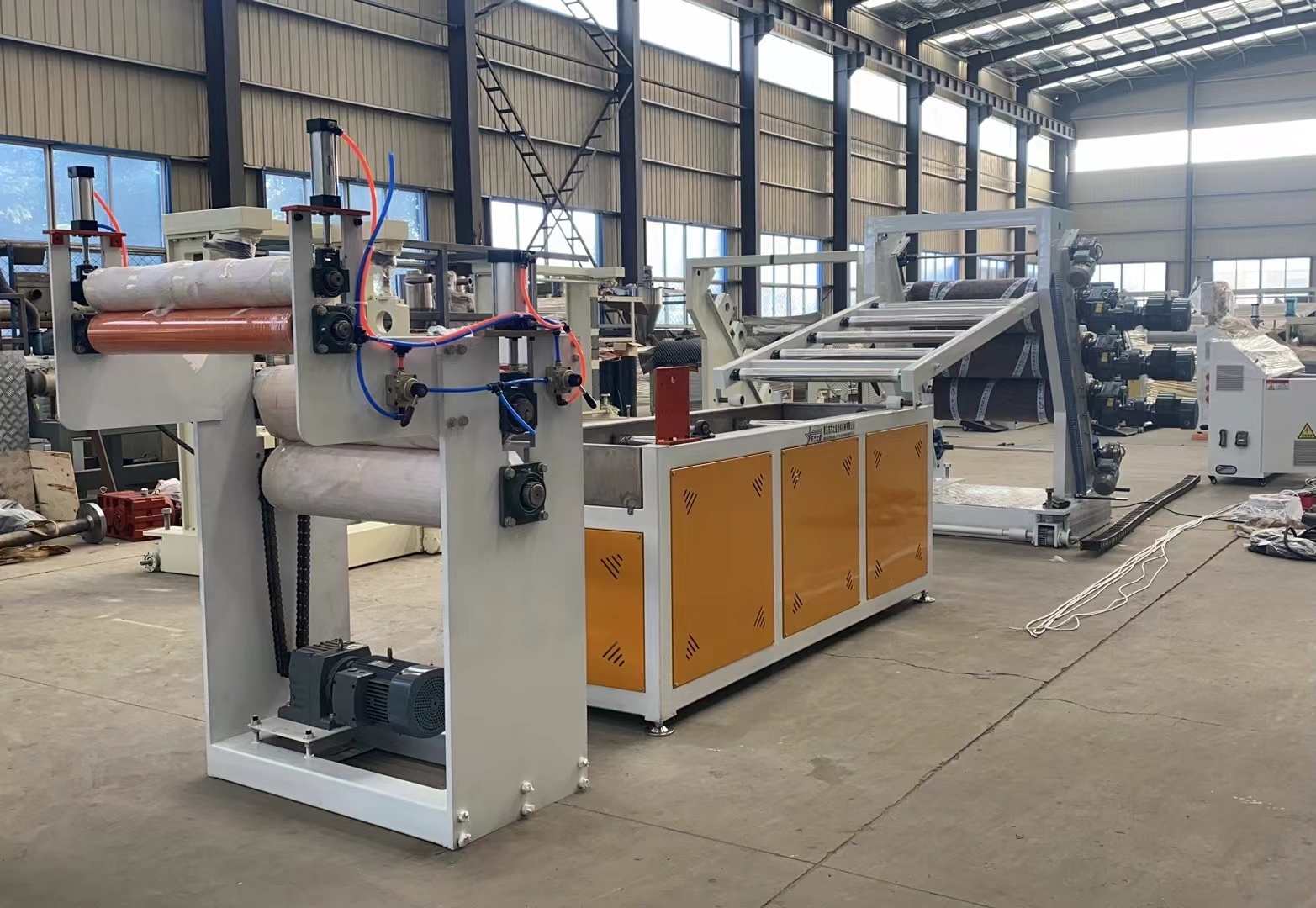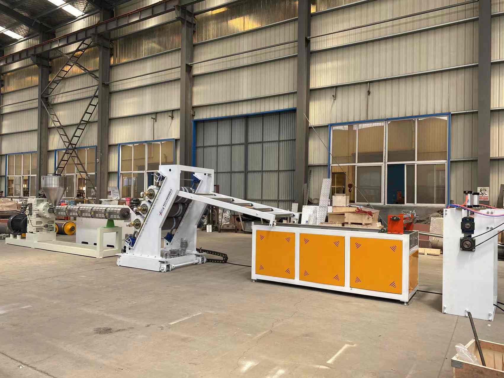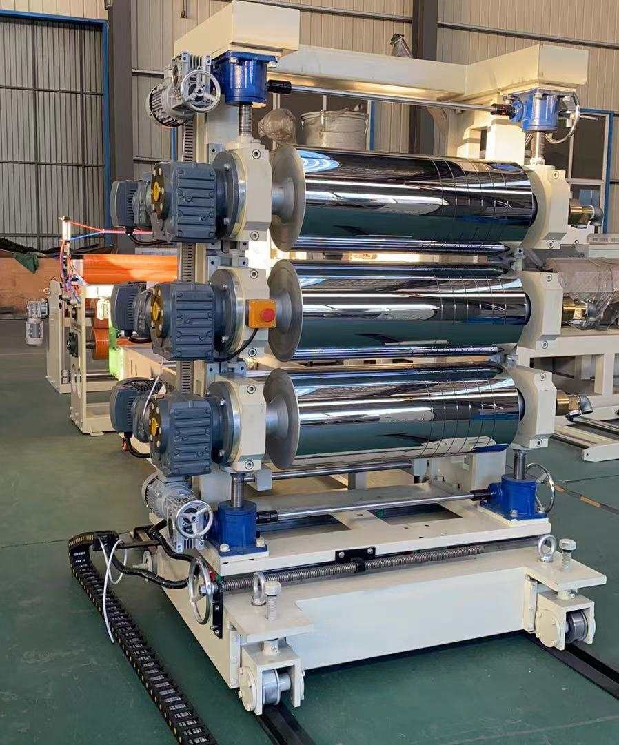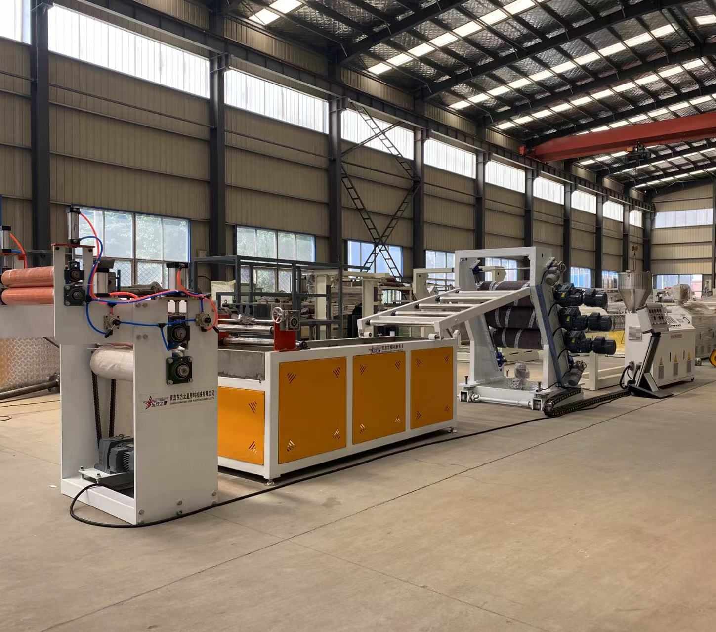 Výrobní linka na PVC průhledné měkké dveřní závěsy: Schopné vyrábět PVC průhledné plastové fólie o šířce od 200 do 600 milimetrů a tloušťce 0,8 až 3 milimetry. Vybavení zahrnuje jednošnekový extrudér SJ90 nebo SJ-120, nastavitelnou pružnou matrici ve tvaru T, svislý nebo 45stupňový nakloněný tříválcový kalandr, regulátor teploty vody tři v jednom, nerezovou chladicí konzolu vybavenou širokoúhlým nastavitelným ořezávacím nožem, gumový válečkový tažný stroj a dvoupolohový natahovací vzduchový expandér. Vyrobené plechy mají lesklý povrch, vysokou průhlednost, měkkost, bez prasklin, bez zápachu, bez bublin, jsou pružné, odolné proti chladu, otěru, kyselinám a zásadám a korozi.