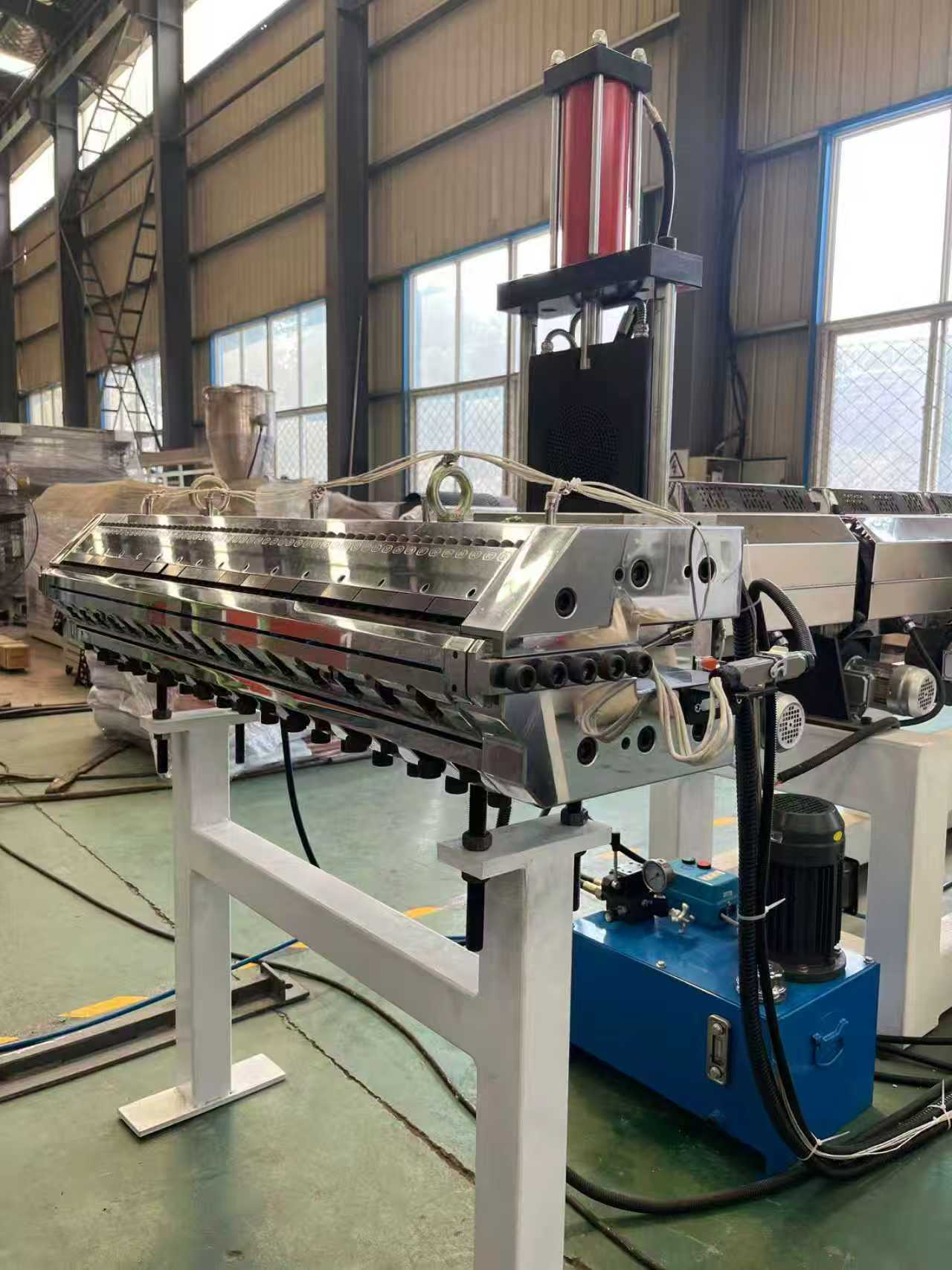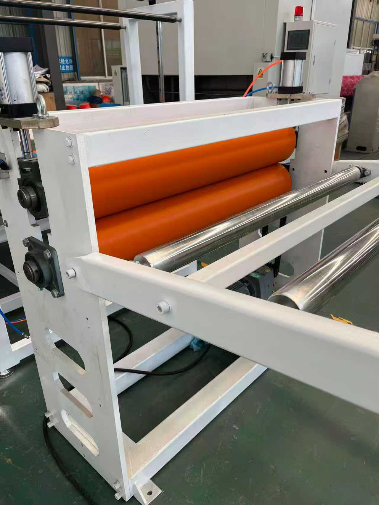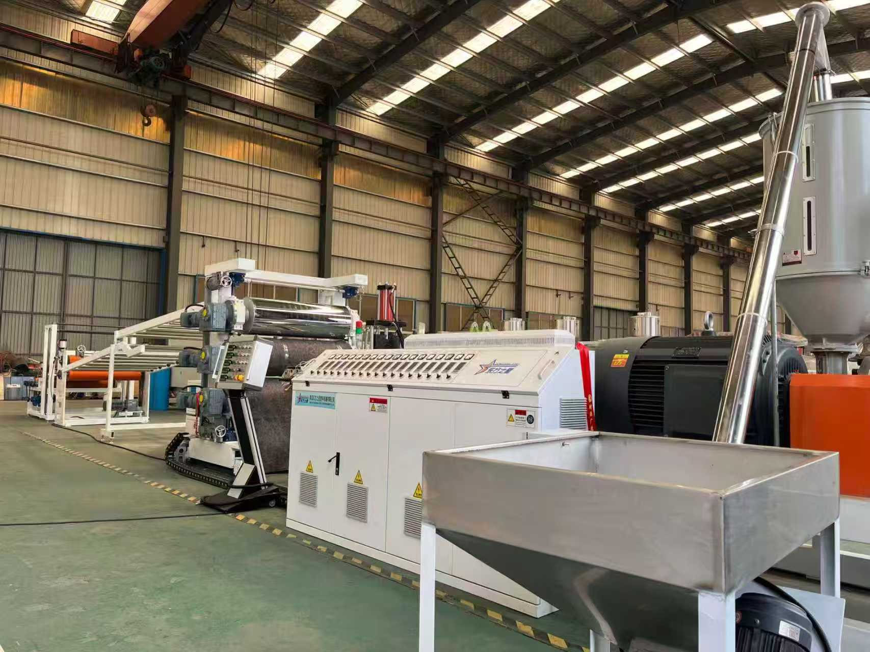 Vybavení protiskluzových podložek TPE-1000mm autokoberce: Zařízení se skládá především z jednošnekového extrudéru, tříválcového kalandru, 6metrového chladicího držáku, gumového válečkového trakčního stroje, stříhacího stroje a zařízení dopravníkového pásu.